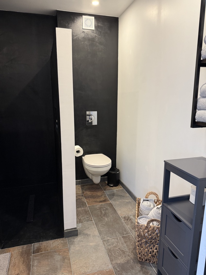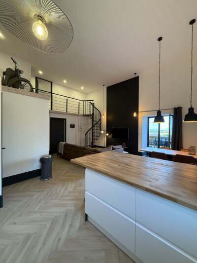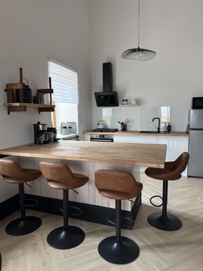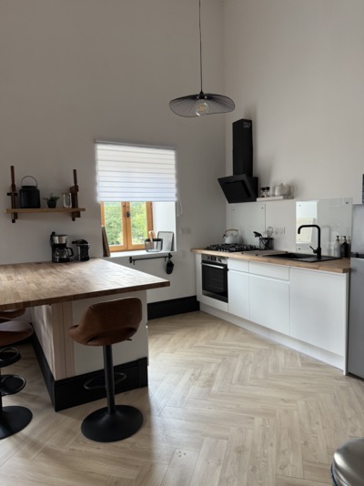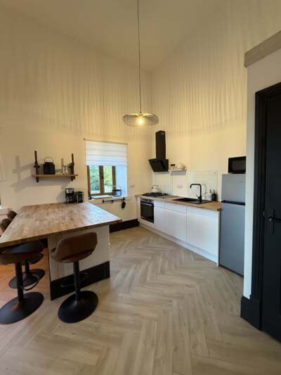 De Gite heeft een ruime living met open keuken en hoog plafond en een ruime badkamer. De keuken is volledig ingericht en voorzien van een vaatwasser, koelkast met vriezer, gasplaat, oven en magnetron. In het woongedeelte staat een lekkere grote hoekbank.
